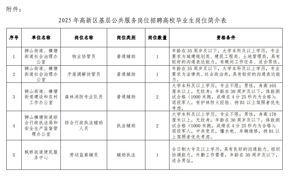 岗位主要包括各部门在市(县)区、街道(乡镇)、社区(村)等基层设立的公共服务类岗位,包括但不限于劳动保障协理员、劳动关系协调员、社区矫正、法律援助、社会工作者、城市管理、农业农村和卫生健康等基层岗位,具体岗位及要求详见附件。