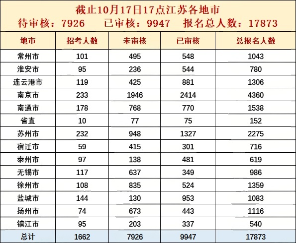 2026国考工作地点在江苏地区的报名人数(截至10月17日17:00)