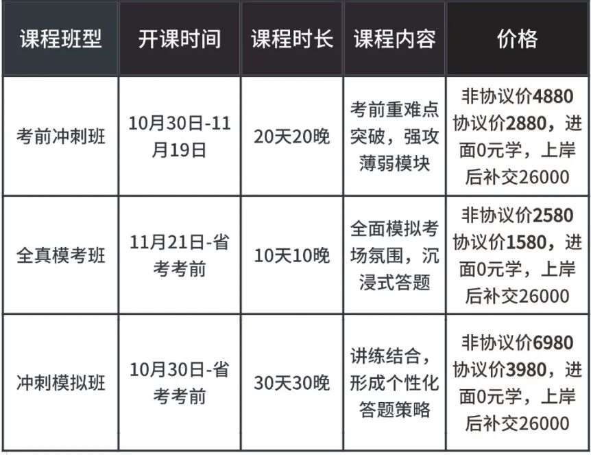 全真模考班。11月21日到考前。10天10晚。按照考场要求全真模拟,并且进行面对面查漏补缺。