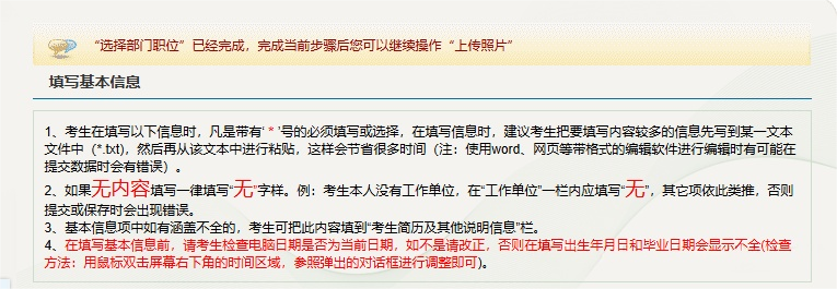 2、如果无内容填写一律填写“无”字样。例:考生本人没有工作单位,在“工作单位”一栏内应填写“无”,其它项依此类推,否则提交或保存时会出现错误。