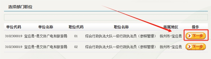 点击查询后,可以看到该部门下所有的岗位,在报名岗位后面,点击下一步,一定要核对好岗位信息之后,点击报考此岗位: