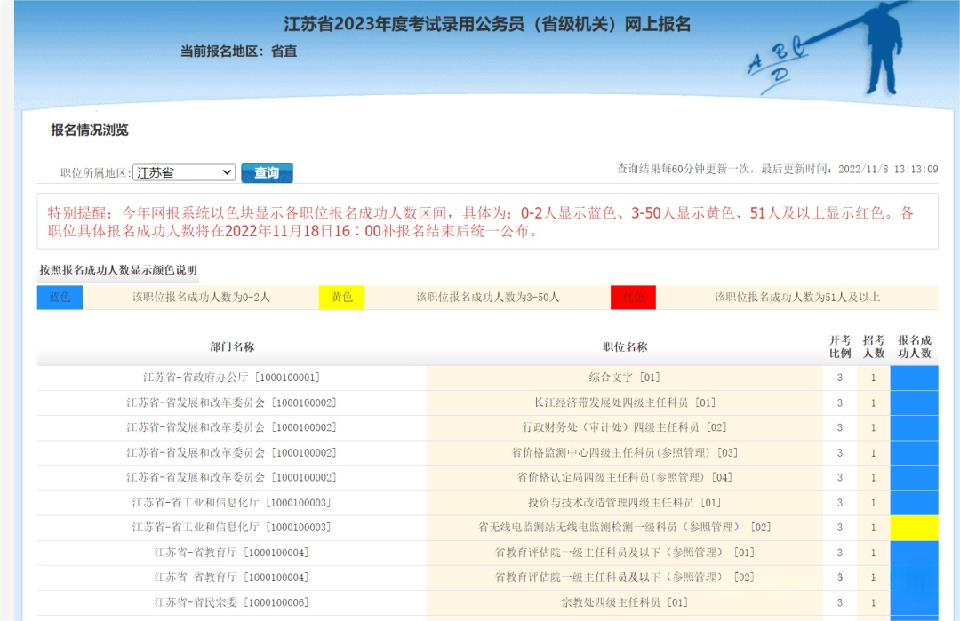 报名系统以色块显示各职位报名成功人数区间,具体为:0-2人显示蓝色、3-50人显示黄色、51人及以上显示红色。各职位具体报名成功人数将在2023年11月17日16∶00补报名结束后统一公布