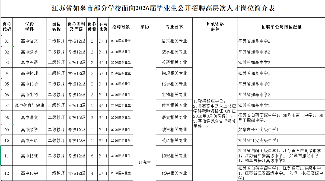 5.具备教师职业所需的综合素质和报考相应的专业技能,符合报考岗位要求的资格条件,详见《江苏省如皋市部分学校面向2026届毕业生公开招聘高层次人才岗位简介表》(附件1):