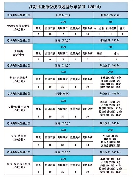江苏事业单位的岗位类别分为管理岗、工勤岗、专技岗。其中专技岗包含经济类(会计审计、统计及其他)、法律类、计算机类、英语类。不同的岗位类别考察的侧重点不一。