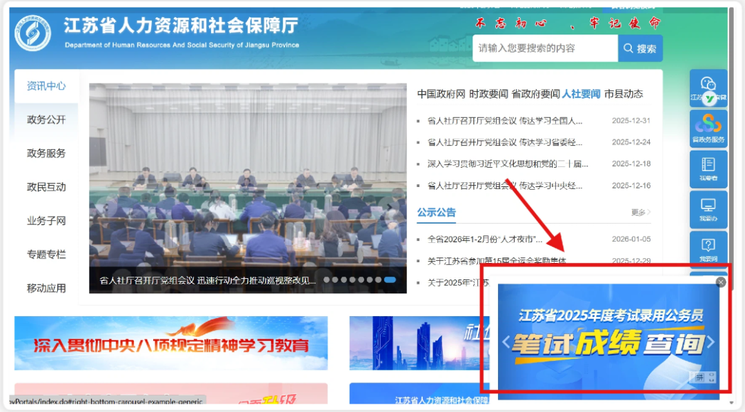 登录【江苏省人力资源和社会保障厅】,找到【26省考*笔试查询】,输入【身份证号+准考证号】查询