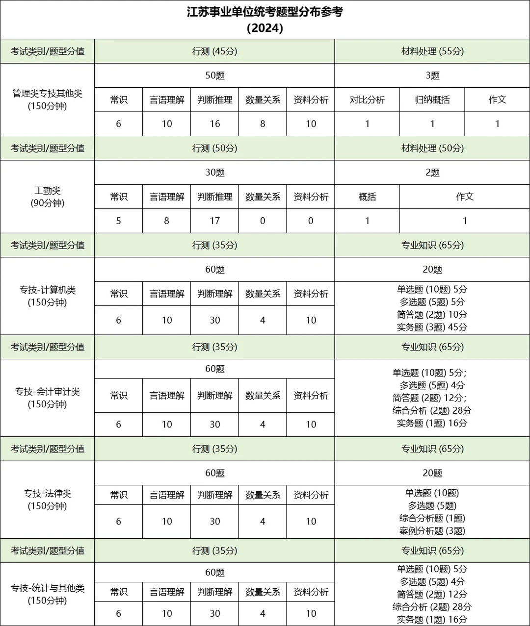 江苏事业单位笔试统一考查《综合知识和能力素质》,按岗位类型分为三类试卷: