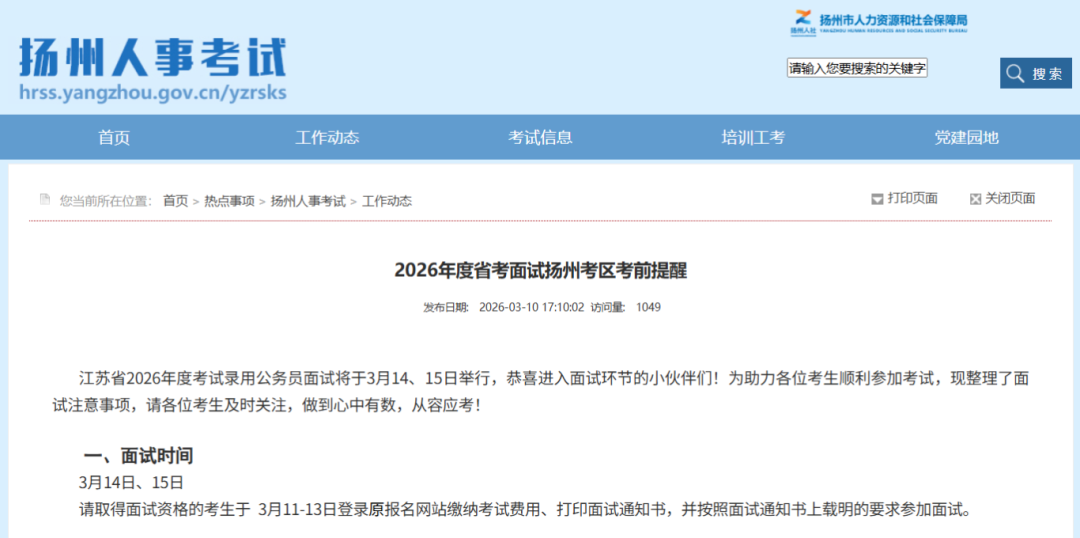 2026江苏省考面试统一于3月14日、15日举行