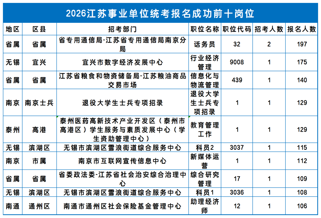 截至22日16:30,江苏事业单位统考报名人数前十的岗位,报名人数均已过百!
