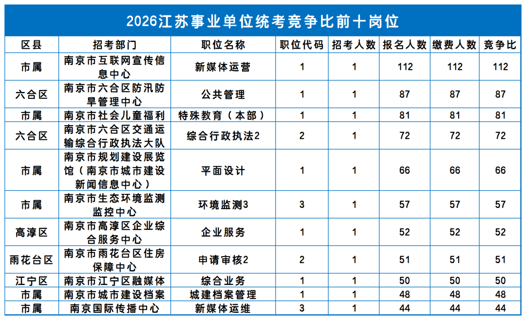 截至22日16:30,竞争*激烈的岗位是南京市互联网宣传信息中心的新媒体运营岗位,竞争比112:1!