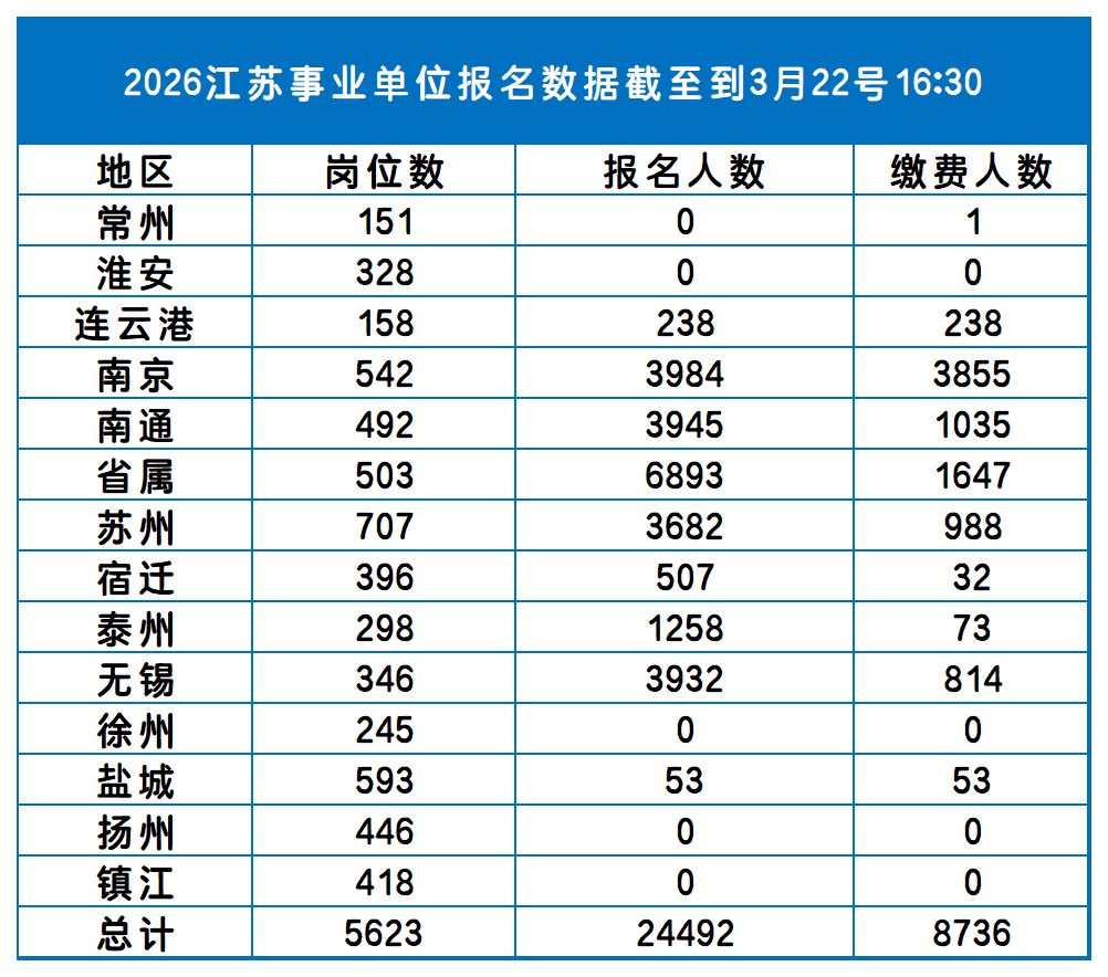 26江苏事业单位统考报名数据【更新至3月22号16:30】附岗位表及电子版备考资料